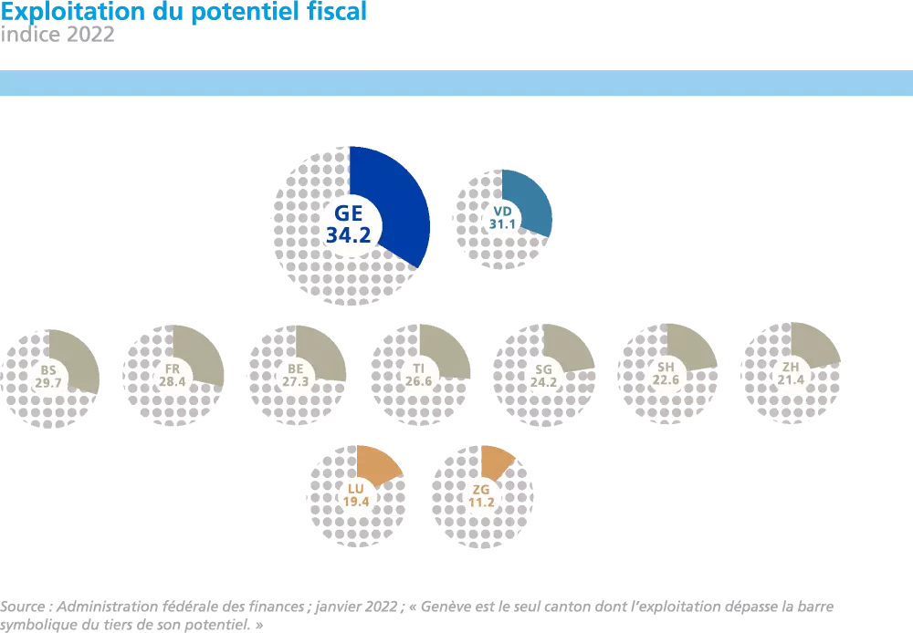 Genève fait malheureusement honneur à sa réputation de canton le plus « vorace » de Suisse et ponctionne quelque 34% de son potentiel de ressources. En d’autres termes, les recettes fiscales genevoises se montent à plus d’un tiers des revenus, fortunes et autres bénéfices genevois imposables et ce constat n’a pas changé depuis 2016. En effet, Genève était déjà alors le seul canton à dépasser la barre symbolique du tiers de son potentiel. À l’autre extrémité de l’échelle, le fisc zougois se contente de 11,2%.