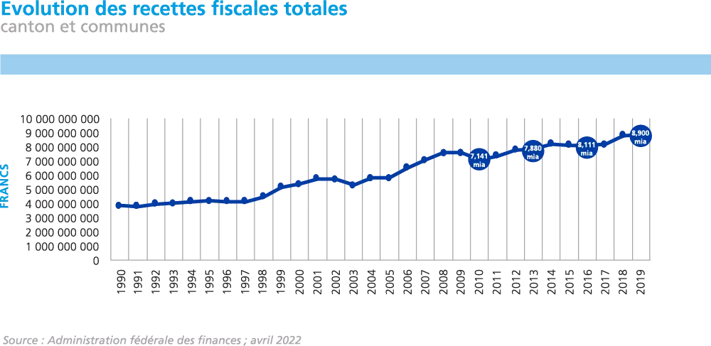 Effectivement, depuis 2012, les recettes fiscales du canton et des communes ne cessent de croître pour franchir, en 2021, la barre symbolique des dix milliards de francs, soit un record jamais atteint jusqu’à présent et ce, malgré la crise du Covid-19.